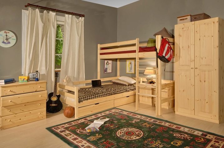 جميع السلالم مصنوعة من خشب الصنوبر المصمت. يمكنهم تحمل وزن يصل إلى 80 كجم ولن ينهاروا تحت الطفل. يُقترح أيضًا تعديل الأسرة المكونة من طابقين مع سلالم بدرجات كاملة ، والتي يمكن تركها مفتوحة كأرفف ، أو يمكن صنع خزانات أو أدراج صغيرة مغلقة..