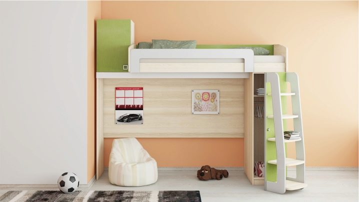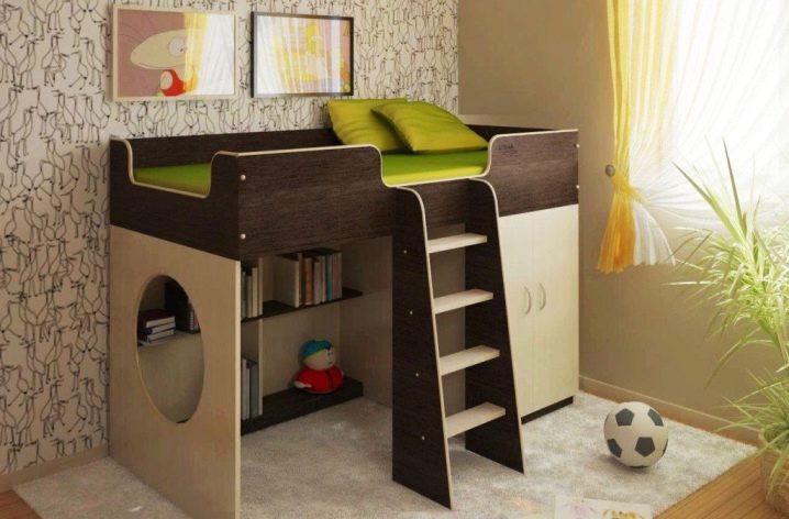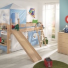 - سرير علوي للأطفال. مرتبة هذا النموذج ليست عالية جدًا ، يوجد في الأسفل درج ورف للألعاب. ارتفاع هذا السرير 1230 ملم. مكان للنوم 80×160 سم