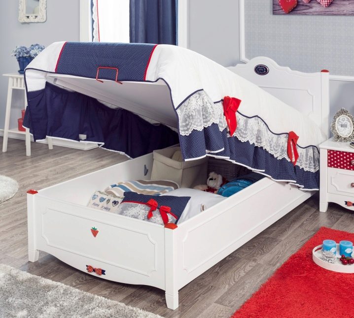 يتيح لك السرير بآلية رفع توفير مساحة في الغرفة لألعاب وأنشطة الطفل: ضع الأشياء والألعاب والمنسوجات التي لا تستخدم كل يوم في القاعدة.