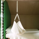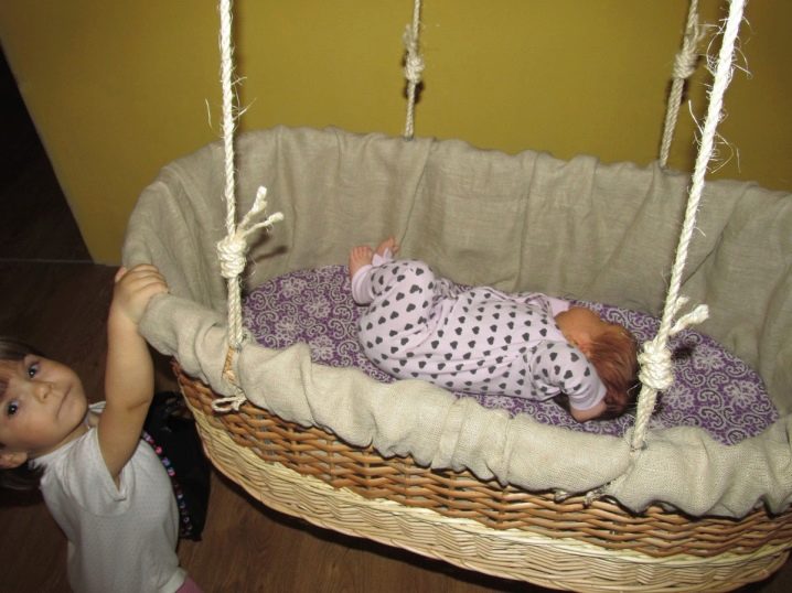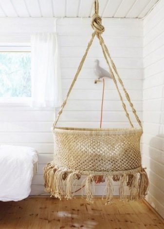 سرير الأطفال معلق من السقف بخطاف. يمكن أن تكون مادة المهد مختلفة جدًا. غالبًا ما يتم تعليق حمالات الخوص ، ولكن يمكن العثور على نماذج خشبية.