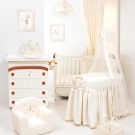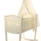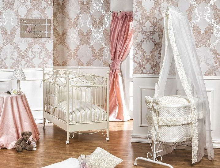 للحصول على تصميم أكثر تعقيدًا ودقة للغرفة ، فإن المهد مع قطعة قماش أو رتوش من الدانتيل مناسب ، والجوانب المحبوكة يدويًا مع الكشكشة تبدو رائعة للغاية. يمكن أيضًا تزيين المظلة بالفراشات المزيفة أو الكريات أو الدانتيل.