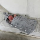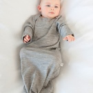 - نموذج 7. تصميم مثير للاهتمام لحقيبة نوم بأكمام عملية يمكن طيها للخلف لإخفاء أصابع حديثي الولادة. يجمع النموذج بين سحاب موجود في التماس الجانبي وأزرار في وسط عنق الحقيبة.
