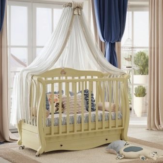 في الموديلات من الشركات المصنعة الجيدة ، عجلات ذاتية التمركز مع سدادات ومنصات سيليكون على العارضتين ، ما يسمى بـ “أسنان”. سرير الأطفال هذا لا يتحرك ، ولكن يمكنك لفه إلى سرير الوالدين ، وخفض الجدار الأمامي – وفي الليل سيكون من المناسب للأم الوصول إلى الطفل وتهدئته دون الخروج من السرير.