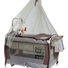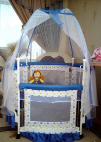 سرير روضة الأطفال. عادة ما تحتوي هذه الأسرة على جدران قماشية مع شوائب شبكية. هذا مزيج في تصميم واحد لسرير الأطفال الكلاسيكي وروضة للأطفال. هذا النوع من الأسرة مفيد جدًا عند السفر. يمكن فكها وتخزينها بشكل مضغوط في كيس صغير. في الليل ، تستخدم الساحة للنوم وأثناء النهار للعب. نظرًا لاستخدام الساحات أيضًا في الألعاب ، تسود الألوان الزاهية في الألوان والصور المختلفة.
