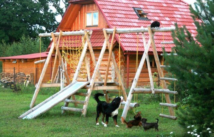 حل ممتاز للعطاء هو تركيب أرجوحة مع قضيب تسلق إضافي أو سلم. يتحول الهيكل إلى مجمع رياضي صغير للترفيه النشط للأطفال. هيكل خشبي مع حبال متصلة بأعمدة متينة (قواعد).