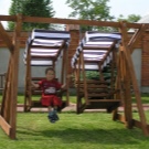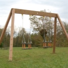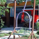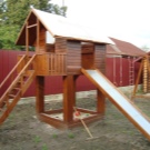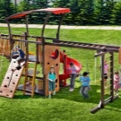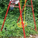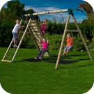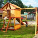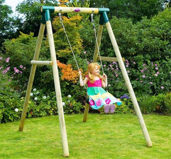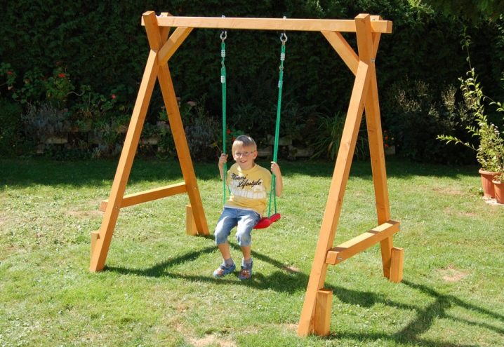 حل ممتاز للعطاء هو تركيب أرجوحة مع قضيب تسلق إضافي أو سلم. يتحول الهيكل إلى مجمع رياضي صغير للترفيه النشط للأطفال. هيكل خشبي مع حبال متصلة بأعمدة متينة (قواعد).