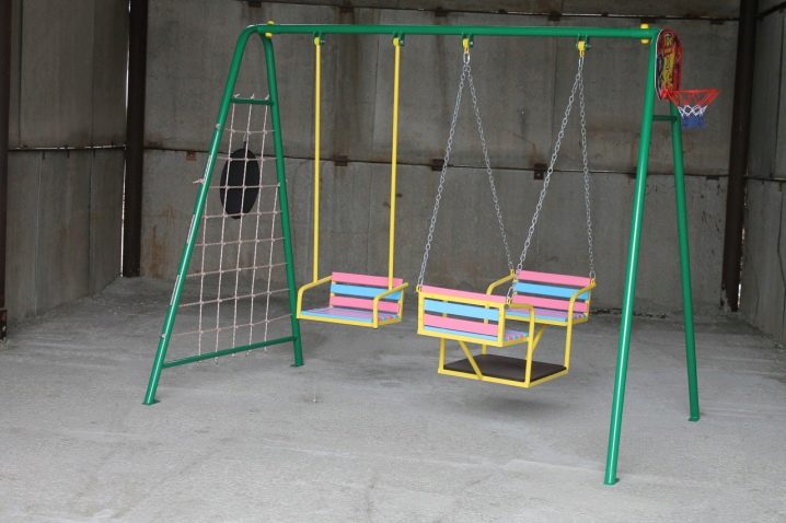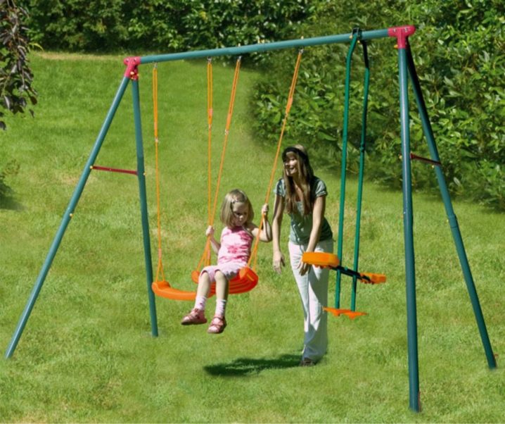 - أرجوحة معدنية. إنها هيكل ، هيكلها أو إطارها مصنوع من المعدن. هذا هو الخيار الأكثر ديمومة ، وهو مصمم “للإنتاجية” العالية للمستخدمين الصغار. يتم تثبيتها عادة في الملاعب. هذا النوع من التأرجح من الصعب أن تصنعه بنفسك ، لكن الأمر يستحق ذلك. الميزة الكبيرة هي أنهم قادرون على تحمل وزن شخصين بالغين يتأرجح بكامل قوته..