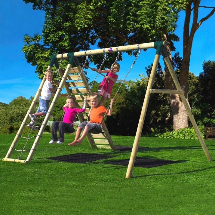 - تأرجح مزدوج. أرجوحة معلقة بمقعد واحد لطفلين. الميزة هي تطوير المهارات للعمل في أزواج: تنسيق الحركات ، وتطوير الصفات القيادية ، والقدرة على إيجاد طريقة للخروج من موقف صعب (تريد التأرجح ، لكنك بحاجة إلى إيجاد طريقة للقيام بذلك معًا) . الجانب السلبي هو وجود تعليقين فقط ، لذلك يتمسك كل طفل بالتعليق بيد واحدة فقط. من الطرق الجيدة للخروج من الموقف هو التأرجح مع التعليق الثالث ، والذي تم تركيبه في مستوى المقعد في المنتصف ويسمح لكلا الطفلين بالبقاء بشكل مريح.