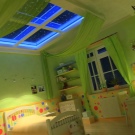يشعر جميع الأطفال ، دون استثناء ، بمشاعر رقة متساوية تجاه السقف الممتد ، الذي يشبه السماء المرصعة بالنجوم – وأصغر الحالمين ، والبراغماتيين الصغار ، والسيدات الشابات الرومانسيات ، وما زلن بلا لحية ، لكنهن بالفعل معجبين شجعان جدًا بالرحلات الجوية في الأحلام و في الواقع. تساعد تقنية النجمة المتلألئة على إعادة إنشاء مصابيح LED صغيرة أو كابلات ألياف ضوئية رفيعة متصلة بسقف ساتان ممتد أو تنزل من خلاله إلى ارتفاعات مختلفة ، وتتلقى الضوء من جهاز العرض ويعكسه إلى نهايات هيكل السقف.