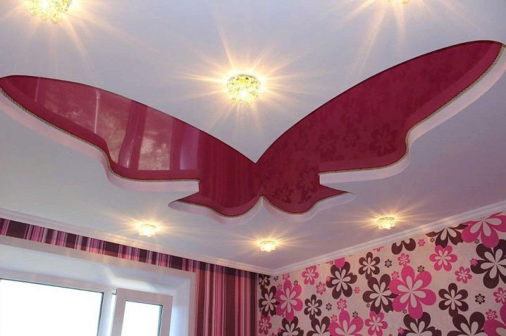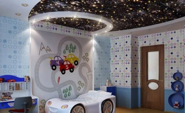 بالإضافة إلى ذلك ، يوفر هذا السقف إمكانيات تصميم غير محدودة تقريبًا. هنا يمكنك تجسيد الفكرة الأكثر جرأة. تحظى أفكار السماء الكونية بالنجوم بشعبية كبيرة. مثل هذا السقف سوف يهدئ الجهاز العصبي للطفل قبل النوم. بالإضافة إلى ذلك ، يمكن أن تكون الطبقات المتعرجة بالقرب من السقف مصنوعة من دريوال. بالنسبة للفتيات ، يمكنك ترتيبها على شكل فراشات وللأولاد على شكل طائرة..