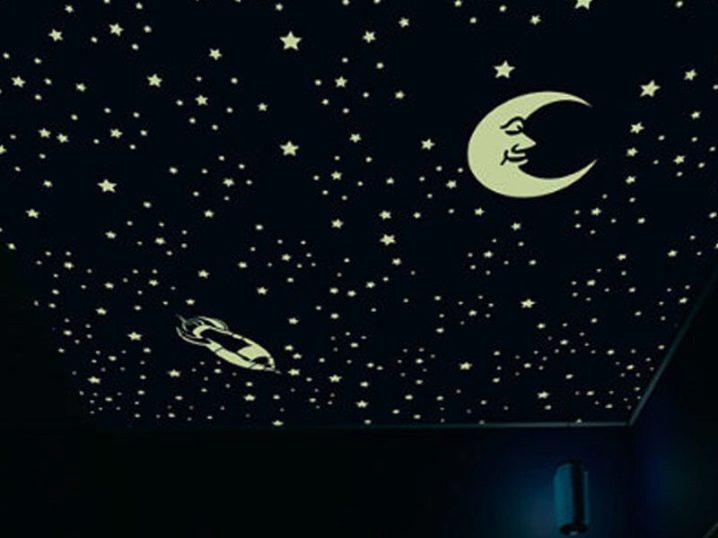يمكنك أيضًا تزيين السقف بالملصقات الأصلية. يمكن أن تكون على شكل حيوانات ، أزهار ، حشرات. تحظى نجوم الفينيل ذات الطلاء المضيء بشعبية كبيرة لدى الأطفال من جميع الأعمار.