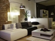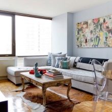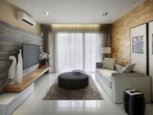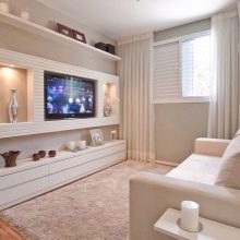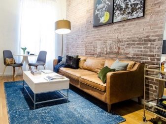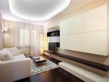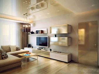 في الداخل الحديث ، يحتل المكان الرئيسي ويفترض أقصى قدر من الحرية في الفضاء. لذلك ، يتم اختيار الأثاث العملي والمدمج لتأثيث الغرفة. ستكون المحولات والأجهزة المدمجة أيضًا خيارًا جيدًا لقاعة صغيرة. لجعل الغرفة تبدو مريحة ، يمكنك استخدام أرفف صغيرة ذات إضاءة خلفية كديكور. تحتل الأريكة في غرف المعيشة هذه مكانًا مركزيًا ، ويجب أن يكون تنجيدها أحادي اللون ومشرق ، كما يُسمح بأنماط صغيرة على شكل خطوط واضحة.