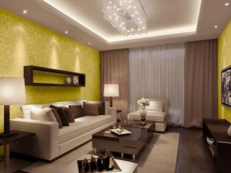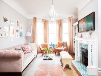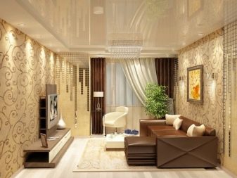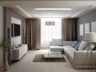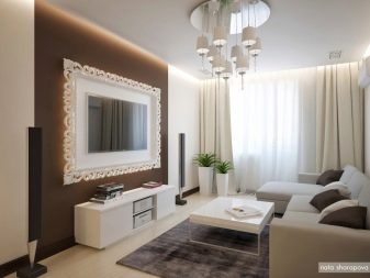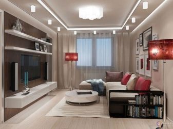 تقليديا ، يمكن أن تتكون القاعة من مكان للراحة والنوم والعمل.. يتم تصميم غرفة المعيشة وفقًا للمشاريع الفردية لكل عائلة ، مع مراعاة احتياجات كل مستأجر. بغض النظر عن عدد المناطق الوظيفية الموجودة في القاعة ، أهمها منطقة الاستجمام ، فهي مزينة بأثاث مريح وتلفزيون. يمكن تخصيص الباقي كمكان للعمل والنوم ومكتبة وحديقة شتوية. يوصى بإجراء تقسيم المناطق بمساعدة التشطيبات المختلفة واستخدام الأقسام المتنقلة.
