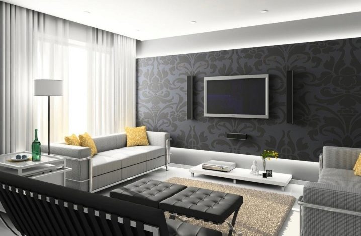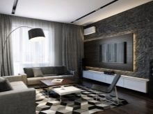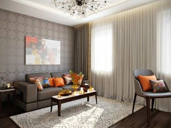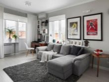 اختيار جيد لتصميم غرفة المعيشة الحديثة هو اللون الرمادي الفاتح. إنهم بحاجة إلى تزيين الجدران والسقف في الغرفة. يوصى بفرض أريكة صغيرة على أحد الجدران ووضع طاولة قهوة بجانبها. كرسي بذراعين كبير وعثماني ناعم مناسبان كأثاث إضافي ، بينما يجب أن يكون لون المنتجات والمواد المستخدمة فيها متطابقين. يمكن تزيين الجدران بصورة ورفوف صغيرة.