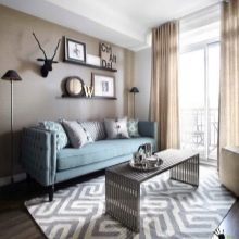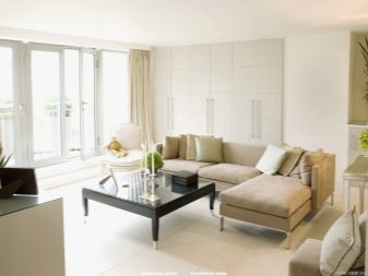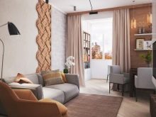 يفضل استخدام هذا الخيار الداخلي في غرفة المعيشة مع شرفة. حتى لا تكون مساحة الغرفة محدودة ، تم دمجها مع شرفة ، والتي يمكن أن تكون بمثابة دراسة صغيرة ومنطقة لتناول الشاي. يتم تقديم التصميم بالبساطة والراحة.