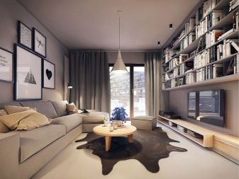 هناك أيضًا أنواع من التصميمات الداخلية يتم فيها دمج غرفة المعيشة مع مكتبة وشرفة وقاعة مدخل. في هذه الحالة ، يتم استخدام غطاء أرضي مختلف أو نفس مادة التشطيب ، ولكن مواد وألوان مختلفة لتقسيم المناطق..