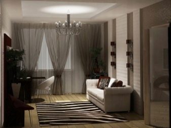 يمكن العثور عليها في تصميم غرفة المعيشة وخيارات للجمع بين غرفة النوم. في هذا التصميم ، من المهم فصل مكان الراحة واستقبال الضيوف من مكان النوم. لهذا ، من الأفضل اختيار الستائر والشاشات الخاصة. في هذه الحالة ، يجب وضع منطقة النوم بعيدًا عن الأبواب أو على المنصة..
