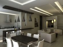 هذا ملحوظ بشكل خاص إذا كان مطور التصميم قد فكر بشكل صحيح في الإضاءة ، والتي يجب أن تسقط إما بشكل مثالي من أعلى ، أو يتم تنفيذها في شكل مصابيح LED على طول حواف سطح الطاولة وتحتها..
