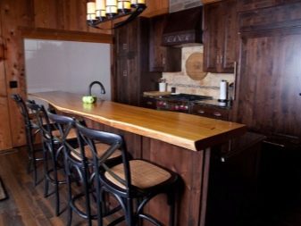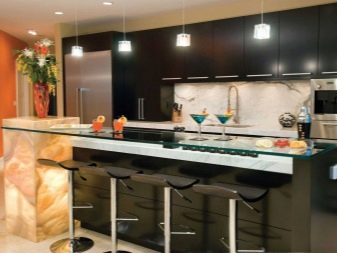 يمكن أن يكون طاولة البار قطعة أثاث مستقلة مدمجة مع جدار أو قطعة أثاث كبيرة أخرى. إذا لم تكن الشقة محرومة من المساحة ، فمن الأفضل أن يكون لديك طاولة بار مع جزيرة: بهذه الطريقة ستشبه طاولة عادية ، ولكن في نفس الوقت تضيف لمسة جمالية غير عادية. في مثل هذه الحالات ، عادة ما يتم اختيار الخيارات ذات سطح الطاولة الكبير. تأتي الموديلات الكبيرة بغطاء من قطعة واحدة وغطاء منفصل..