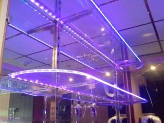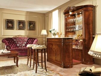 تعتبر الحوامل من الملحقات المهمة (حاملات خاصة تسمح لك بإبقاء النظارات في وضع رأسي) ومساند القدمين متصلة بالحامل نفسه. يمكنك استكمال مجموعة الأواني وتوسيع الوظيفة بمساعدة الأرفف الموجودة على الحائط أعلى المنضدة. إذا وضعت زجاجات تحتوي على كحول باهظ الثمن عليها ، فسوف يزداد الشعور بجو لا يوصف من الراحة وراحة النخبة..