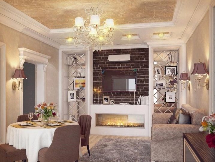 الغرفة التي تجمع بين غرفة المعيشة وغرفة الطعام هي المكان الأمثل لتركيب مدفأة حقيقية بلهب مباشر. كثير من الناس لديهم حفلة شواء بالإضافة إلى مدفأة. يمكنك تجهيز بوابة كهربائية في الغرفة تحاكي اللهب الحي. أسلوب التبسيط مثالي لهذا الخيار. لا تحتاج إلى إذن من السلطة الإشرافية ، وكذلك تجهيز الغرفة بقنوات المداخن..