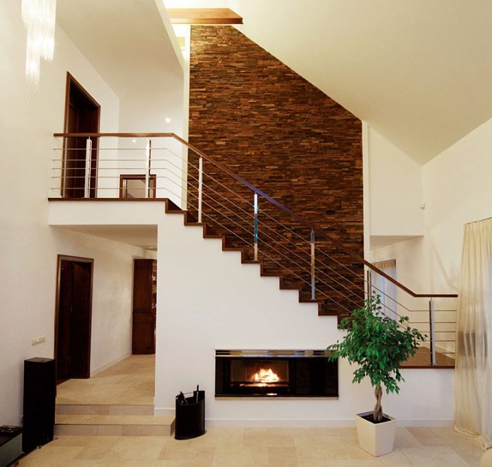 في غرفة المعيشة ذات الدرج ، ستبدو المواقد التي تعمل بالحطب رائعة ، لأنها فعالة للغاية. بمساعدة هذه البوابة ، يمكنك إنشاء جو الفيلم ، الذي لا يجمع فقط صورة ممتعة ، ولكن أيضًا الصوت الجذاب لسجلات طقطقة.