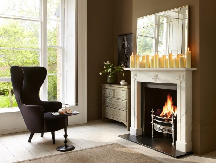في كثير من الأحيان ، يضع أصحاب غرفة المعيشة كراسي بذراعين للمدفأة بجانب البوابات ، مما يؤكد على الأجواء الأكثر راحة. إذا وضعت الكرسي جانبًا بإدخال مدفأة ، فإن الشعلة ستدفئك بشكل ممتع.