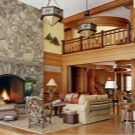 بالنسبة لغرفة المعيشة على طراز الشاليه ، تعتبر المدفأة عنصرًا مهمًا للديكور. في هذه الحالة ، لن تكون البوابة مجرد زخرفة ، بل ستكون أيضًا أداة لتدفئة الغرفة. يمكنك استخدام هذه الزخرفة الداخلية للمدفأة بمساعدة الكتب والتماثيل والصور. طاولة خشبية ذات أرجل منخفضة ، على جانبيها أريكة مع كراسي بذراعين ، ستندمج بشكل متناغم مع جو من البساطة والأناقة..