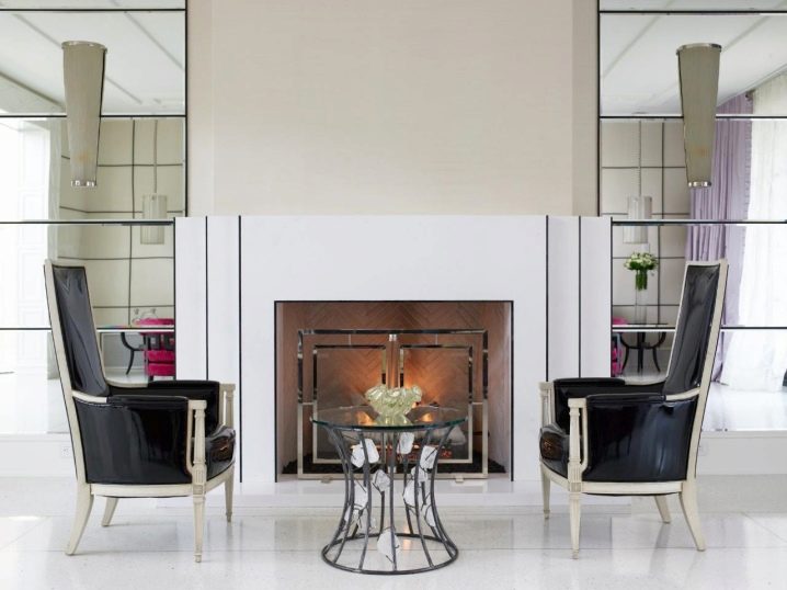 أسلوب آرت ديكو مشهور بشكل لا يصدق. المصممون والمصممون يحبونه كثيرا. السمة الرئيسية لهذا النمط هي أصالته. يجب أن يحتوي الجزء الداخلي على ملحقات وأعمال فنية باهظة الثمن. يستخدم الديكور كمية كبيرة من اللمعان واللمعان. سيكون الموقد بمثابة المركز المنطقي للغرفة ، التي توجد فوقها المرآة..