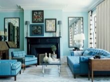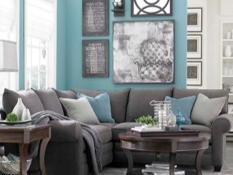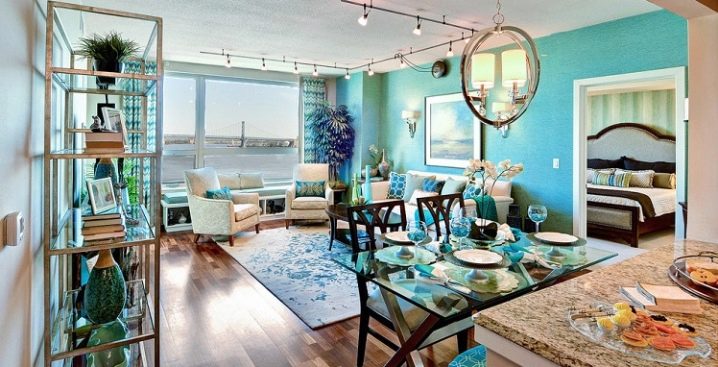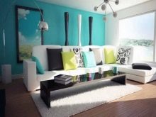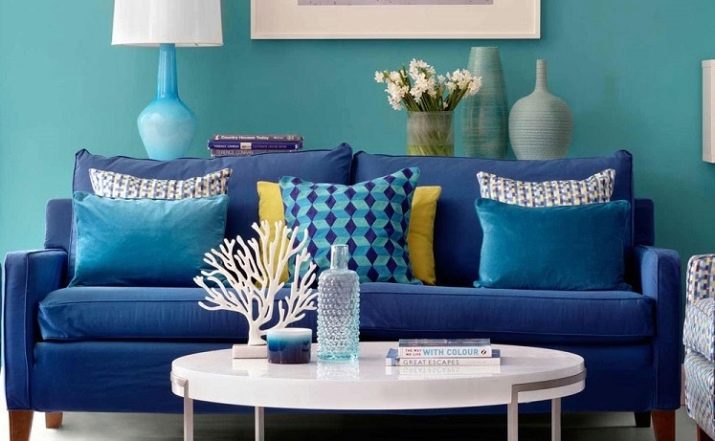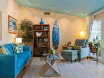 اللون المائي ناجح بشكل لا يصدق في تزيين الغرفة المركزية للمنزل. يربطها معظم الناس بركوب الأمواج والموسم الدافئ والعطلات ، لذلك في مثل هذه البيئة ، من الجيد أن تحلم بالشواطئ والبلدان البعيدة ، وأن تضع خططًا للمستقبل وتنغمس في النعيم..