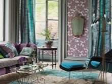 - يبدو التصميم الداخلي البنفسجي الفيروزي غامضًا وغامضًا. هذا المزيج يتحدث عن الذوق غير العادي للمالكين. يمكنك استخدام أي ظلال من أرجواني: من البرقوق إلى الجمشت.