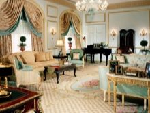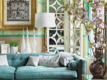 - غرف جلوس كلاسيكية بألوان الفيروز ، فهي تشبه غرف القصر. يمكن استخدام الزبرجد في زخرفة الجدران وتنجيد الأثاث وعناصر التصميم الصغيرة. يتناغم الفيروز في الكلاسيكيات مع الذهب ، والبرونز ، والفضة ، والتي يتم تطبيقها بالنقش على القماش أو ورق الحائط.