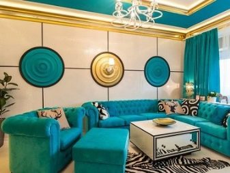 يتم تقديم الفيروز في مجموعة ألوان غنية: من الأكوامارين المبهر إلى الزبرجد. وهذا يسمح باستخدام الظل الطبيعي في العديد من مشاريع التصميم والأنماط المختلفة. أي اختلافات في الفيروز ترضي العين ، وتساهم في الاسترخاء ، ولكن لا تذهب بعيدًا عنها في داخل غرفة المعيشة – يجب أن يكون كل شيء باعتدال. عندها فقط سيظهر اللون تمامًا ، مما يمنح الغرفة الرئيسية في المنزل أسلوبًا وتفردًا: