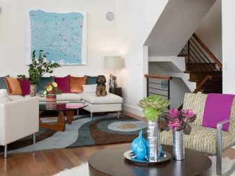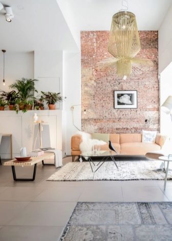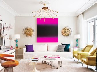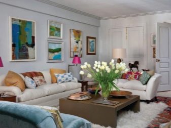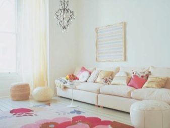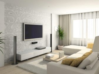 غالبًا ما تحتوي الغرف الفسيحة ذات الجدران الفاتحة على حد أدنى من الديكور. إذا كان هناك زجاج بانورامي ، فإن المناظر الطبيعية خارج النافذة ستزين غرفة المعيشة ليس أسوأ من الصور. ولكن حتى لو ظهر جدار من الطوب فقط ، يمكنك تعليق الستائر بطباعة الصور. الحل المثير للاهتمام هو استخدام منسوجات التنجيد وظلال وسائد الأريكة وأغطية الأثاث.. في الوقت نفسه ، يبدو التصميم الداخلي مثيرًا للاهتمام بشكل خاص إذا تم استخدام وسائد ذات أنسجة مختلفة في التصميم..