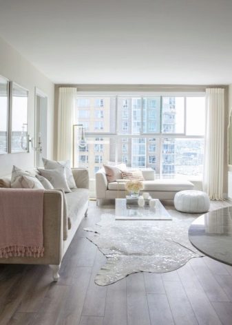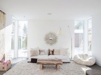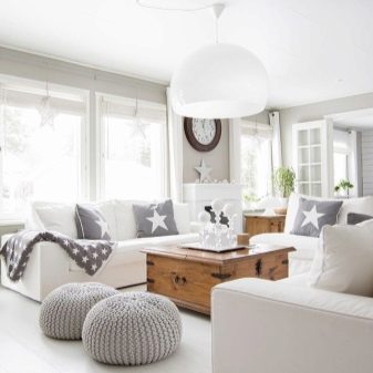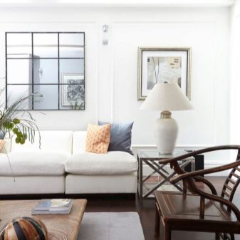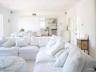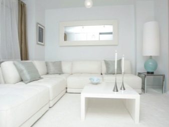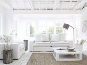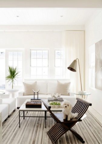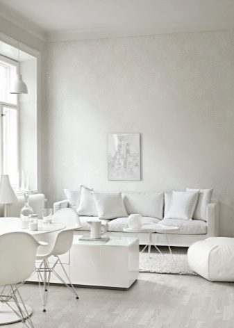تتطلب الأسطح الفاتحة مزيدًا من الصيانة أكثر من الأسطح الداكنة ؛ أي بقعة عليها تجعلها محسوسة على الفور. في غرفة المعيشة البيضاء ، المكان الأول ليس التطبيق العملي ، بل الجمال الجمالي. علاوة على ذلك ، توجد الآن مواد يسهل تنظيفها وتحتفظ بمظهرها الأصلي لفترة طويلة. الألوان المحايدة قادرة على الجمع بين الأشياء التي تبدو غير متناسقة للوهلة الأولى. تعكس الأسطح ذات اللون الأبيض الثلجي الضوء جيدًا ، مما يتيح لك الكشف عن الحجم.