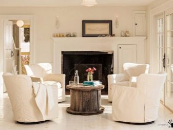 في غرفة المعيشة ، يتم وضع طاولة القهوة في مكان بارز ، والتي تلعب أحد الأدوار الأولى. ليس من الضروري على الإطلاق إخضاعها لنظام الألوان العام. إذا كانت الطاولة مظلمة ، فسوف تؤكد على انعدام الوزن للجدران والأثاث الأبيض. سيبدو سطح العمل بنسيج غير عادي أكثر غرابة.