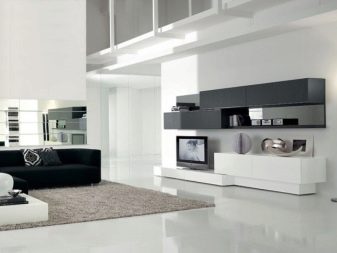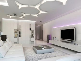يشبه هذا المسكن منزلًا عالي التقنية في المستقبل ؛ تستخدم الألوان اللونية بشكل أساسي في داخل غرفة المعيشة. يمكنك تطبيق طرق مختلفة للتصحيح البصري للمساحة (الأسقف متعددة المستويات وتقسيم المناطق والزجاج والمرايا). ستعكس الجدران الفاتحة ضوءًا كافيًا ، وتبدو بشكل متناغم على خلفية الأثاث بنوع معدني من السطح.