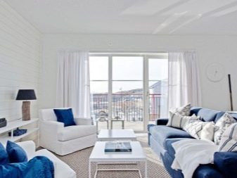 في المظهر البحري ، يستخدمون السمات المرتبطة بساحل البحر. يمكنك إضافة البيج إلى الأبيض الأساسي لخلق وهم الشاطئ الرملي. سوف يملأ اللون الأزرق والفيروزي الغرفة بالانتعاش في الطقس الحار. من خلال إضافة نغمة زرقاء ونسيج خشبي طبيعي ، يمكنك تحويل غرفة عادية إلى سفينة سياحية أو مقصورة يخت فاخر..
