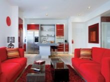 سيضيف هذا التباين الدفء والراحة إلى جو القاعة. تبدو الأريكة والكراسي ذات الذراعين باللون الأحمر الدافئ رائعة على الحائط الأبيض ، وكذلك بجانب الستائر البيضاء والسجاد الأبيض الثلجي..