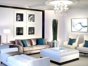 لجعل اللون الأبيض لغرفة المعيشة معبرًا ، يجدر إضافة ثريا أصلية وشمعدانات جدارية وخضراء حية إلى التركيبة الداخلية.