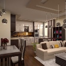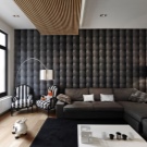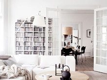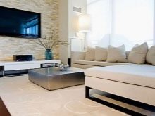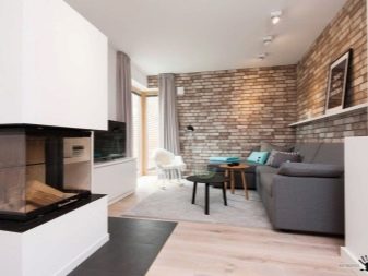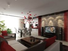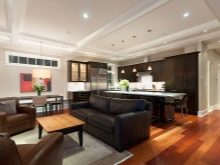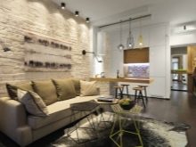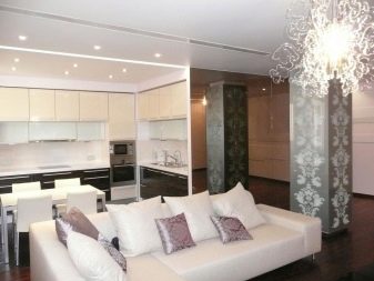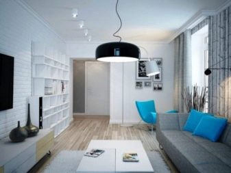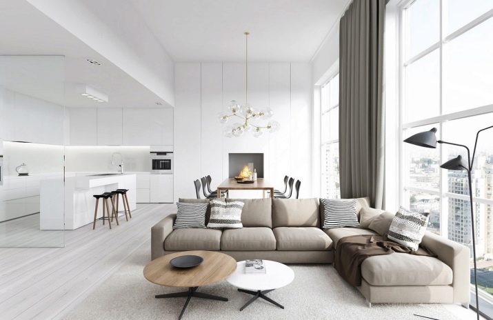 إذا كنت ترغب في تقسيم غرفة المعيشة إلى مناطق ، فمن الأفضل القيام بذلك بدون حواجز مادية في إطار الطراز الحديث – يمكنك تحقيق الفصل باستخدام الاختلاف في الإضاءة وألوان التشطيب ومواد الأثاث. يمكن تمييز المناطق بطرق مختلفة. أصبح من المألوف الآن الجمع بين غرفة المعيشة والمطبخ وغرفة الأطفال أو الرواق ، وفي الشقق المكونة من غرفة واحدة يتم دمجها مع غرفة النوم.