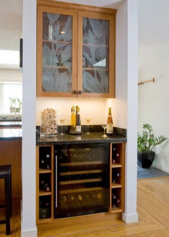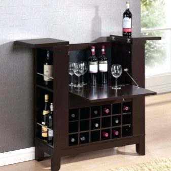 منذ فترة طويلة لم يكن بار المنزل أو طاولة البار عجبًا في المناطق الداخلية للمطبخ أو غرفة المعيشة الحديثة. دائمًا ما تكون الاجتماعات الممتعة مع الأصدقاء أو عشاء العائلة مصحوبًا بزوجين من النبيذ المفضل لديك أو المشروبات الأخرى. خزانة ملابس أو خزانة لتخزين مجموعة من المشروبات الكحولية والأطباق الخاصة تكمل تمامًا زخرفة الغرفة وتوضح للضيوف ذوق وتفضيلات صاحب الشقة.