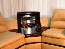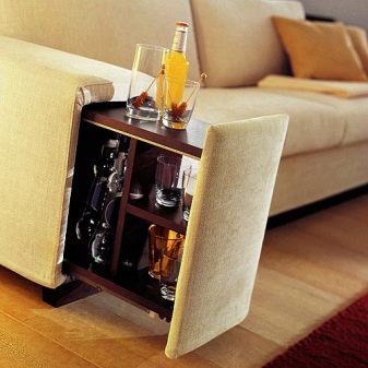 - يمكن أيضًا بناء بار صغير في أثاث منجد. غالبًا ما يستخدم هذا الحل بأسلوب فن الآرت نوفو الحديث. يمكن سحب التصميم من ظهر الأريكة أو الكرسي. يمكن دمج الشريط في مسند الذراع. تتمتع هذه الطرز بسعة صغيرة ، لكنها تساعد في توفير المساحة وإخفاء محتويات الشريط والهيكل بأكمله عن الأطفال..