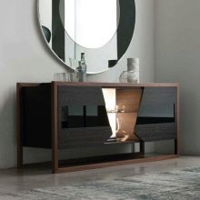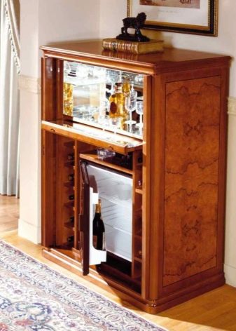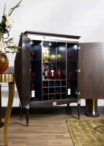 - الهياكل المغلقة. تشبه هذه النماذج خزانة ذات أدراج. المحتوى مخفي عن الأنظار بواسطة أبواب معتمة أو شاشات منزلقة. يحمي هذا الخيار الزجاجات الموجودة بالداخل بشكل أفضل من التلف المحتمل. النماذج المغلقة مناسبة بشكل أفضل في الحالات التي يوجد فيها أطفال في المنزل. سيكون الصغار أقل ميلًا للعب بالزجاجات الجميلة. بالإضافة إلى ذلك ، في حالة الألعاب النشطة في الغرفة ، سيحمي الهيكل المغلق الأطباق نفسها والأطفال من الإصابات المحتملة من الشظايا..