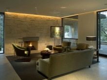 ستساعد الأرضية الخشبية بنمط واضح من ألياف الخشب ورف منحوت مع شبكة من الحديد المطاوع على تدفئة تشطيبات الحجر. تلعب إضاءة غرفة المعيشة دورًا مهمًا.