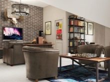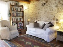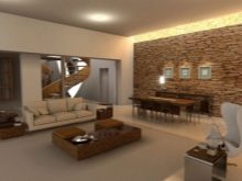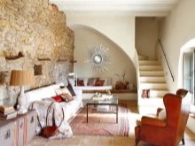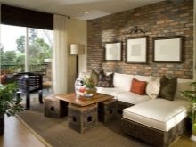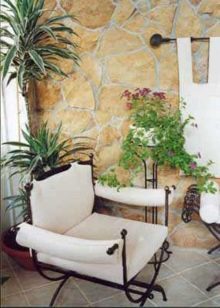 خيار التصميم هذا مناسب للمساحات الصغيرة. يسمح لك بتصميم منطقة ترفيهية كاملة بمساعدة الحلول المعمارية والألواح الحجرية. يجب أن يؤخذ في الاعتبار أن الحجر عبارة عن مادة تشطيب خشنة إلى حد ما ، لذلك من الضروري إضافة القليل من الراحة إلى الداخل. يمكن القيام بذلك باستخدام المفروشات والسجاد والوسائد والمنسوجات..