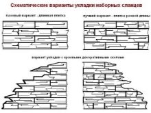 بعد ذلك ، يجب عليك تنظيف الجدار من النهاية القديمة والمحاذاة والرئيسية. يجب أن تبدأ الكسوة من الزاوية من الأسفل إلى الأعلى. يتم التمديد في صفوف ، حيث تكون المفاصل بين الأحجار المجاورة لصف واحد في وسط أحجار الصف الثاني. يتم تجميع مواد الصخر الزيتي والحجر الرملي بسلاسة.