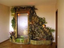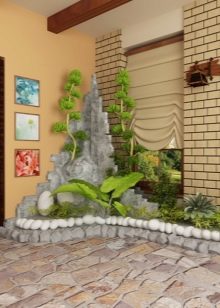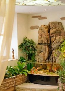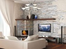 إذا سمحت مساحة غرفة المعيشة ، فستكون إحدى التقنيات المثيرة للاهتمام هي إنشاء ركن للمعيشة حيث توجد خزانات صغيرة اصطناعية وشلالات متتالية ونوافير مزينة بحجر زخرفي. تبدو أحواض السمك والنباتات الاستوائية الكبيرة جميلة على خلفية البناء. الجمع بين الحجر والخشب ناجح. يتناغم بشكل جيد مع المساحات الخضراء ويؤكد الوحدة الطبيعية. يمكن استخدام الحجر ليس فقط لتزيين الجدران والمدافئ: تصميم الأرفف وعدادات القضبان يبدو أنيقًا وممتعًا.
