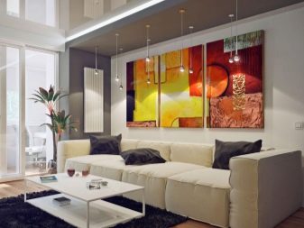 بالنسبة لأولئك الذين يرغبون في جعل المناطق الداخلية مفعمة بالحيوية والعصارة ، من الأفضل استخدام اللوحات. يمكن أن تكون صورة واحدة أو عدة صور تتواصل مع بعضها البعض. ستكون هذه التقنية لهجة مشرقة في الغرفة. استخدام المنسوجات الملونة على شكل وسائد على الأريكة لتتناسب مع السجاد بالقرب من الأثاث يخلق راحة خاصة في الغرفة.