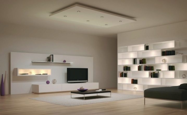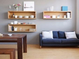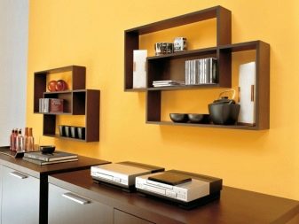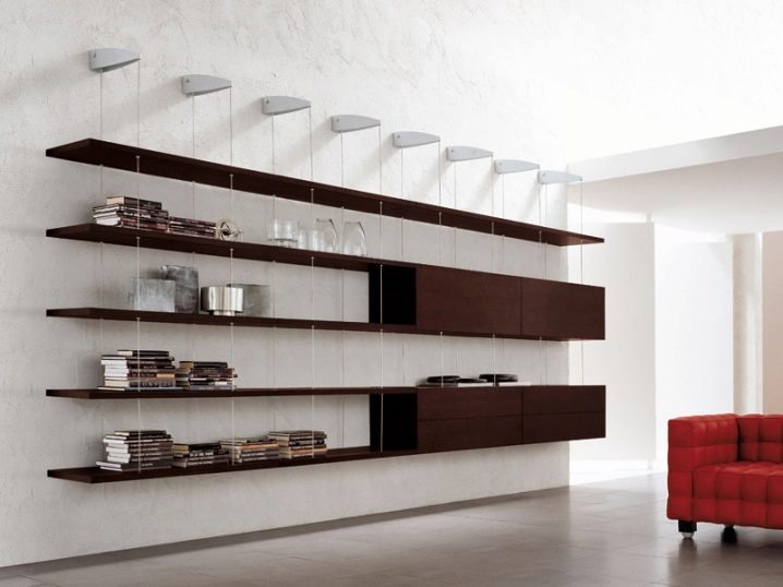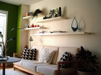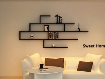 تتوافق الأرفف مع الغالبية العظمى من اتجاهات التصميم. في غرف الضيوف الكبيرة ، تعمل على طمس الخط الفاصل بين التفاصيل الداخلية الفردية. هذه الجودة مناسبة بشكل خاص في الغرف المربعة والمستطيلة..